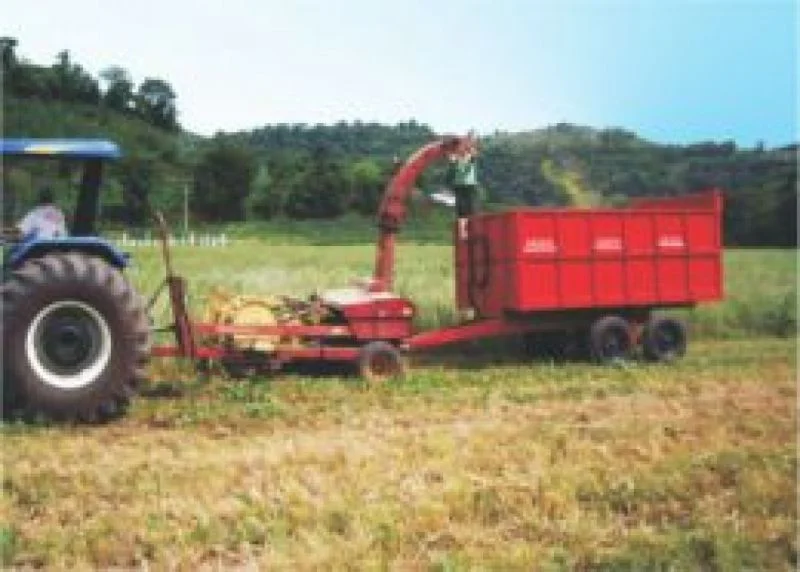Carreta para transporte agrícola. Com pistão hidráulico. Com sistema exclusivo de tampas que facilitam a descarga da silagem. Tem a maior capacidade de carga da categoria (8m³).
