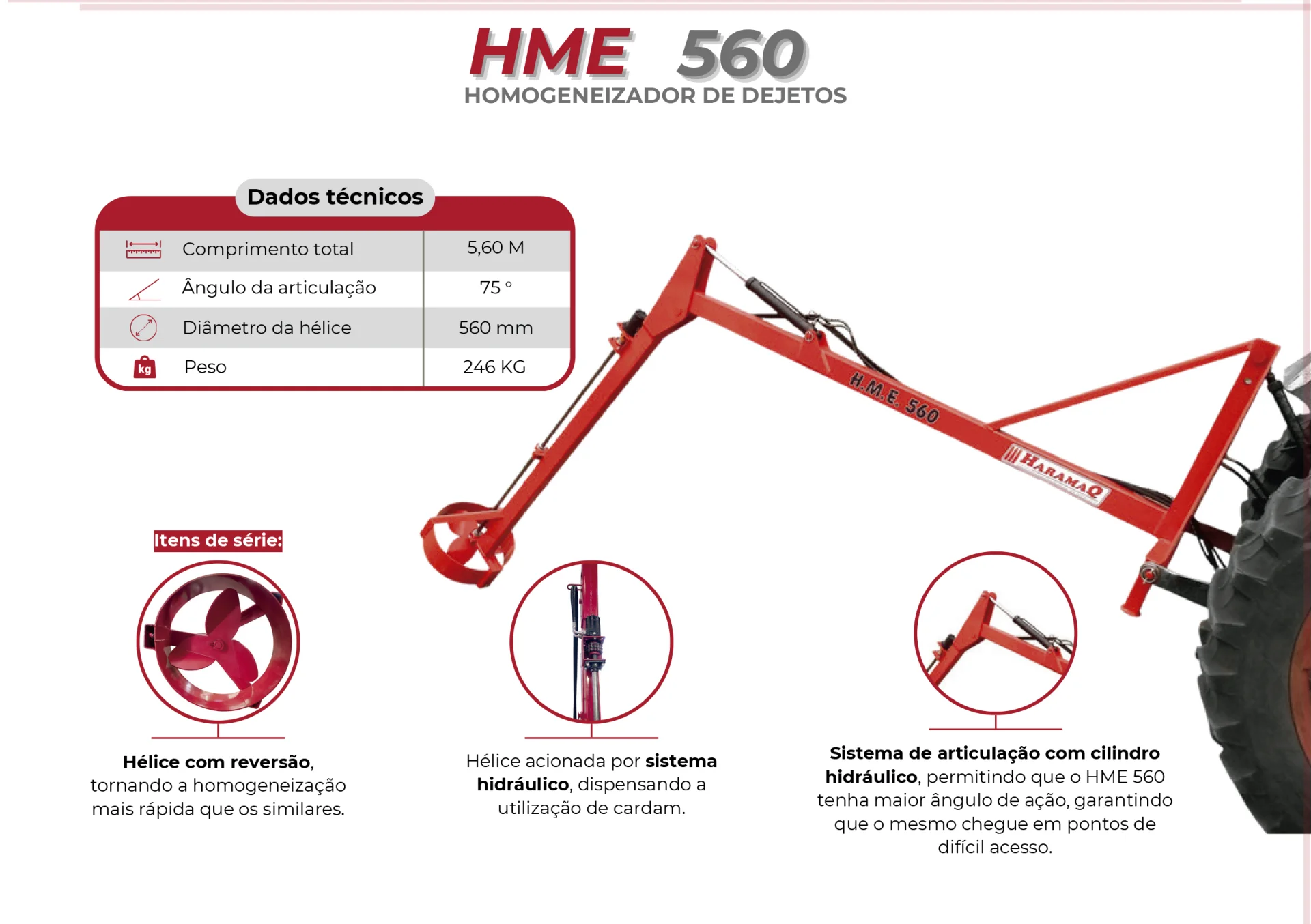 Homogeneizador HME 560: articulação hidráulica e reversão na hélice garantem mistura rápida e homogênea de esterco orgânico com alta eficiência.